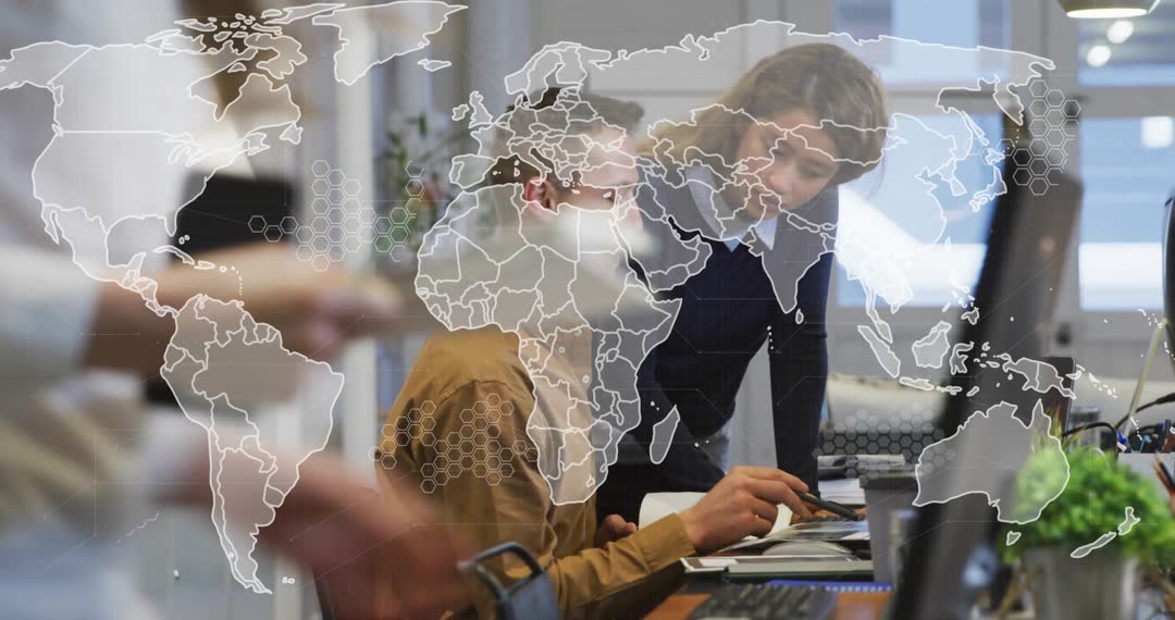 Two colleagues are engaged in a collaborative discussion, marked by a digital world map overlay suggesting global strategy and business planning. Ideal for illustrating modern workplace communication, teamwork, and innovative business solutions. Can be used in articles about international business, technology in workspaces, and strategic planning methods.