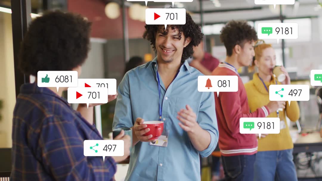 Office colleagues are enjoying a coffee break in an informal setting, discussing ideas and networking. A connection to social media is highlighted through animated digital icons such as likes, shares, and followers floating above them. This video illustrates the atmosphere of a modern work environment with a focus on communication, collaboration, and staying connected digitally. It is suitable for use in articles about contemporary workplace dynamics, team building, and digital engagement strategies. Ideal for blogs, corporate presentations, and social media posts about innovative work practices.