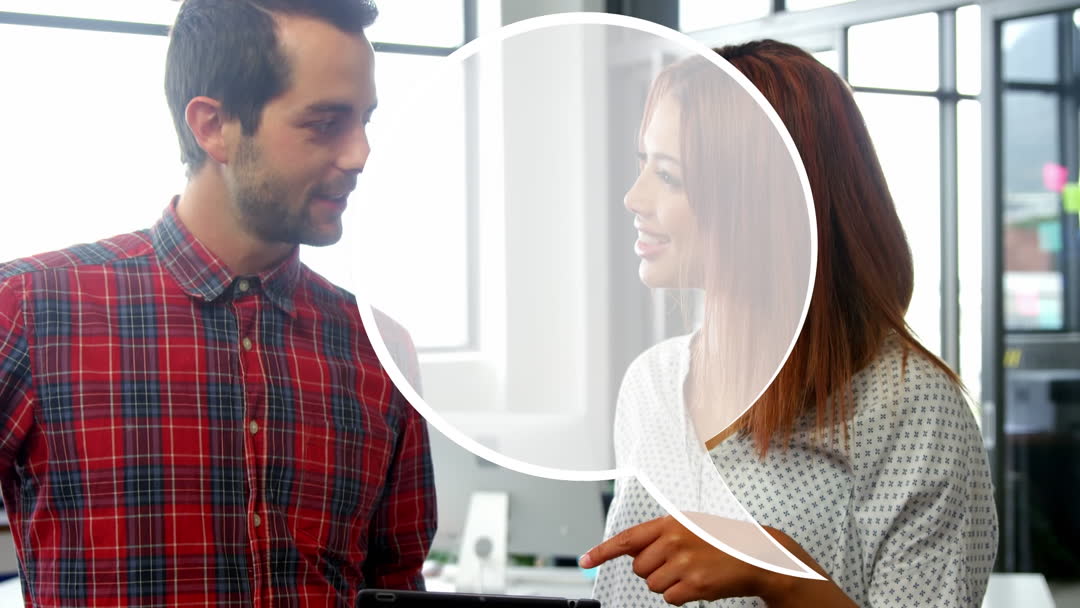The video portrays a male and female colleague engaged in a discussion about digital strategies in a modern office setting. The use of digital icons emphasizes technology and innovation. This visual can be ideal for business and marketing materials, presentations focused on workplace communication, or articles about effective teamwork and collaboration within professional settings.