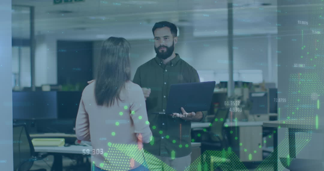 Colleagues Discussing Financial Data Overlay with Glitch Effect Video