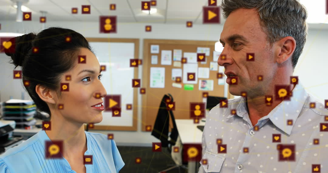 Visual features business professionals having a conversation in a modern office, enhanced with overlay of digital icons depicting a global network and communication symbols. Suitable for illustrating themes of digital transformation, efficient work environment, technology-driven communication, and collaborative innovative projects. Ideal for use in articles related to digital workplace paradigms or advertising sophisticated business software solutions.