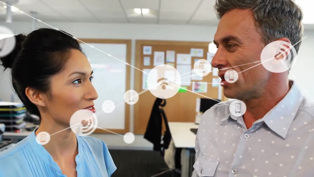 Colleagues exchanging ideas in an office with innovative technology symbols hovering around them. Their engagement demonstrates modern communication and teamwork in a professional environment. Perfect for illustrating technology integration, business collaboration, and innovative office solutions.