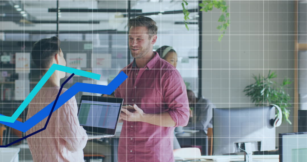 Image depicts diverse professionals engaging in productive discussion at an open office. Blue graphs suggesting growing business metrics appear on top, highlighting a focus on data-driven decision-making. Ideal for illustrating teamwork, corporate strategy, business development, or tech-savvy environments online, presentations, or reports.