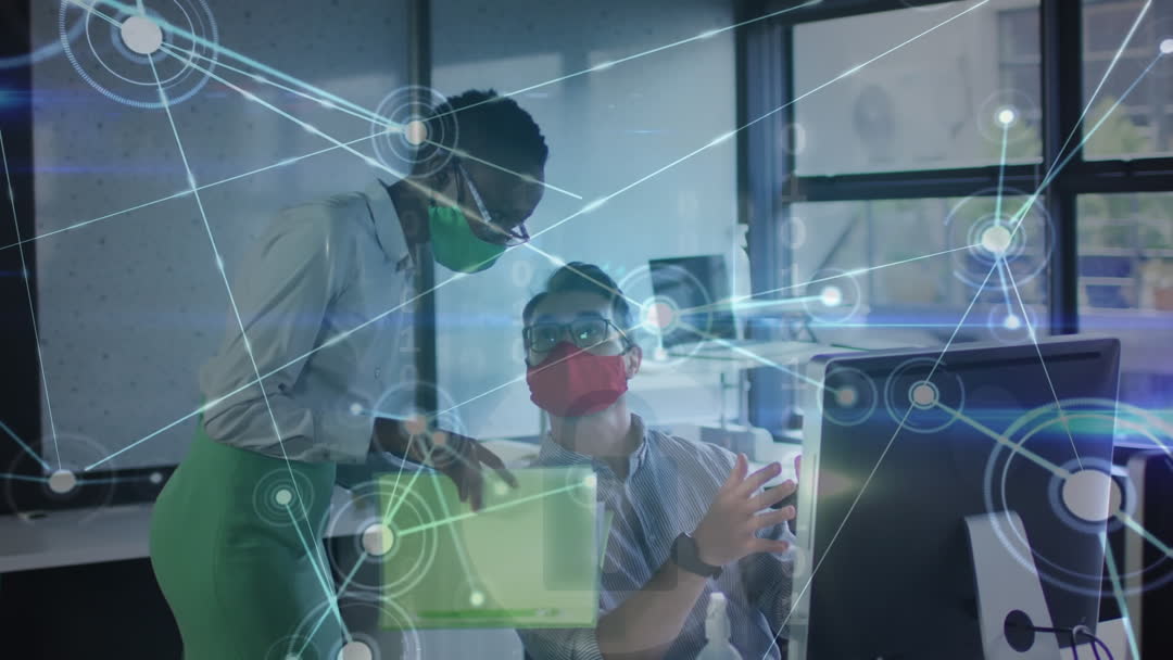 This video features two business professionals wearing face masks, suggesting a modern office environment during the COVID-19 pandemic. They are actively engaged in discussing technology strategy, with a virtual network graphic overlay representing digital communication and connectivity. Ideal for articles on business innovation, remote work strategy, collaboration tools, and teamwork during health crises.