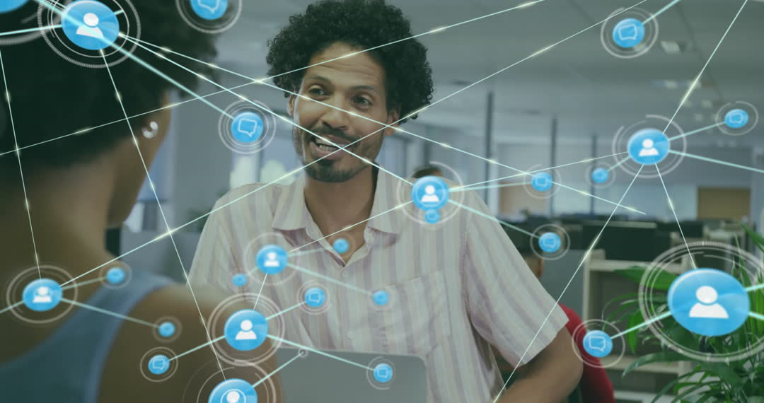 Colleagues Discussing with Digital Connections Overlay in Office Video
