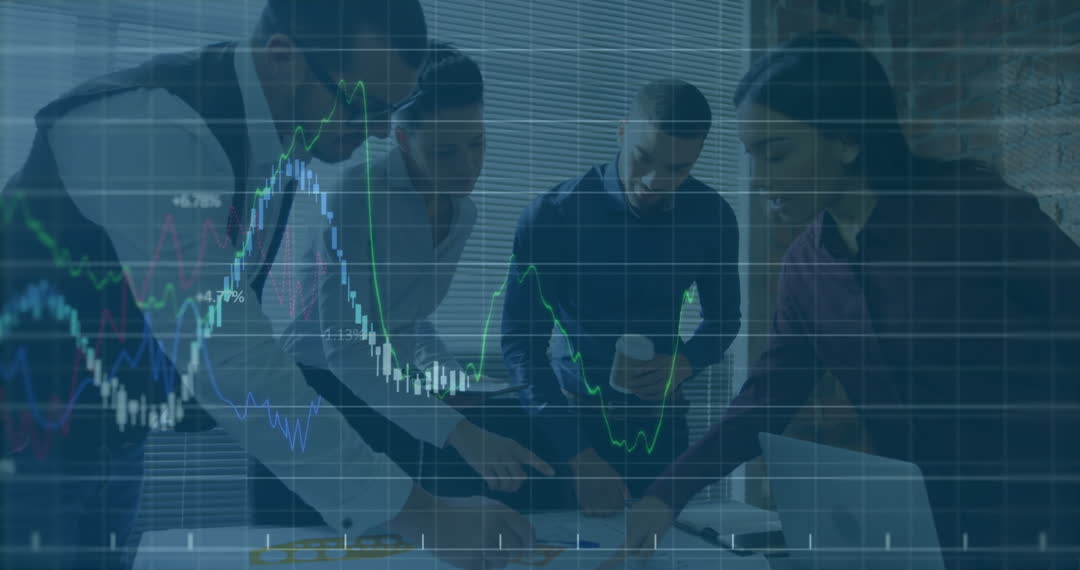 A diverse group of colleagues gathers around a table in an office environment, focused on discussing and analyzing work-related documents, while a digital overlay of financial data and stock market graphs is displayed above them. This video conveys themes of teamwork, strategic planning, and the integration of technology in the workplace. It is suitable for illustrating concepts related to corporate meetings, financial analysis, and data-driven decision making in business presentations, websites, and promotional materials.