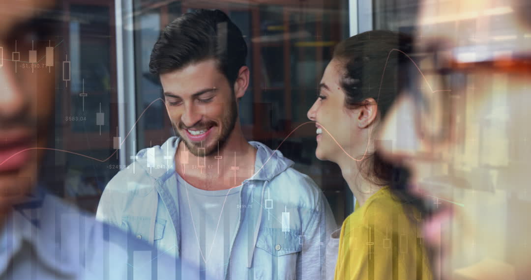 Group of diverse business colleagues engaging and collaborating with an overlay of financial data and analytics in a modern office environment. Visual conveys business environment meeting technology, making it suitable for editorial content on corporate strategy, team-building practices, or financial advisory services advertisements.