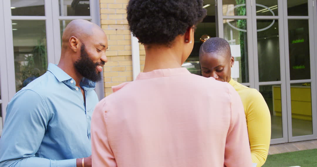 A group of professional colleagues having a friendly and engaging conversation outside an office building. This video highlights teamwork, collaboration, and the natural engagement of business individuals in an informal setting. Ideal for use in corporate presentations, business marketing materials, and articles focused on office culture and teamwork.
