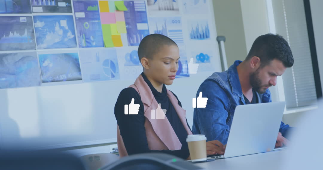 - Colleagues Engaging with Laptop Surrounded by Social Media Likes