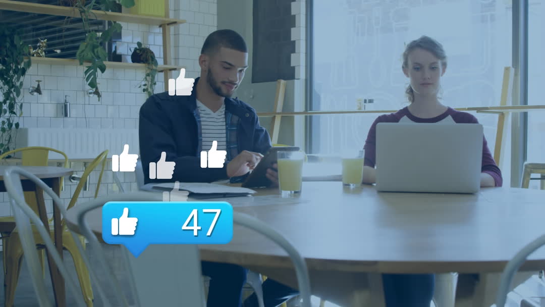 Young professionals in a modern office space engaging with social media on a laptop and smartphone. The digital likes symbols enhance the theme of online connectivity and technology use in a professional setting. Ideal use includes demonstrating digital marketing, teamwork collaboration, or social media strategies.