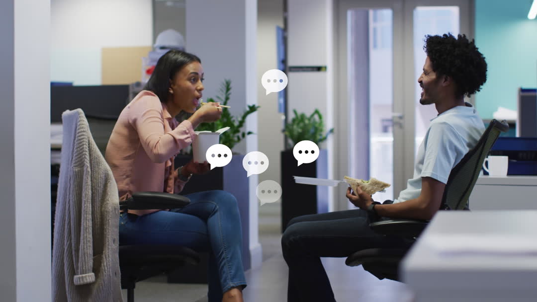 - Colleagues Enjoy Lunch Break with Digital Speech Bubbles in Office