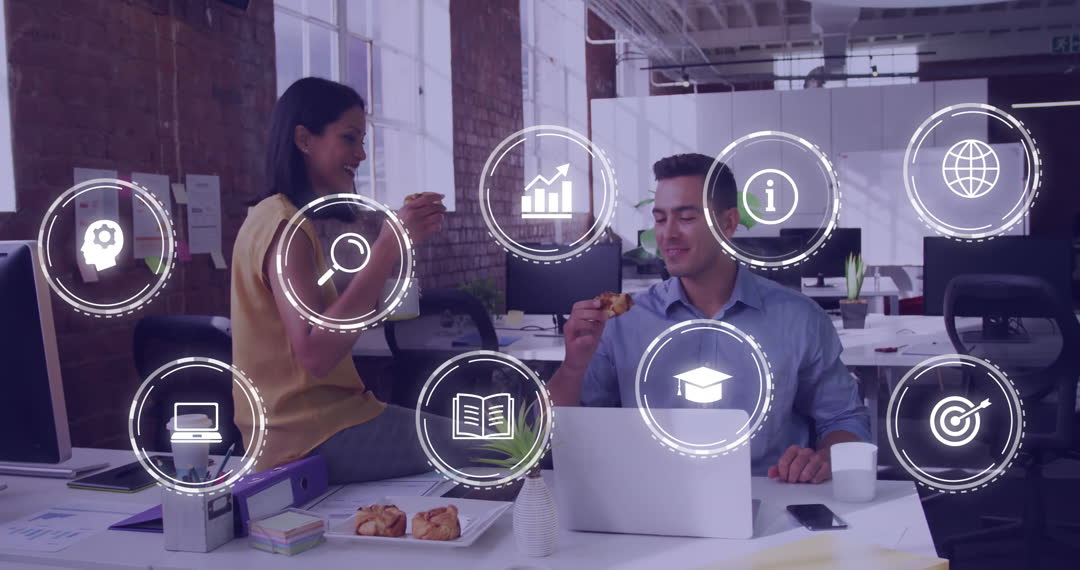 Diverse colleagues enjoying lunch engage in conversation in a modern office. Digital business icons overlayed suggest technology-driven discussion on data analysis, information sharing, and global networking concepts. This visual demonstrates concepts of business collaboration, digital innovation, and proactive team environments, and it can be used for corporate presentations, business articles, or tech-focused promotional content.