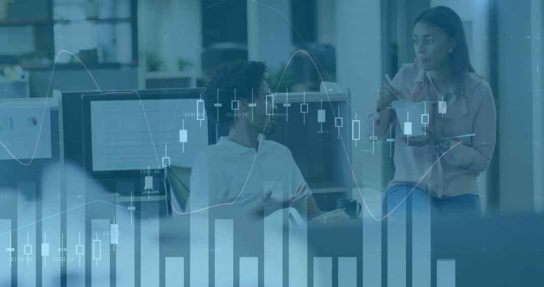Two smiling colleagues enjoying a break in modern office setting with overlaid financial graphs illustrating digital interface capability. Suitable for technology, finance, and business-oriented media content. Highlights workplace diversity and collaboration.