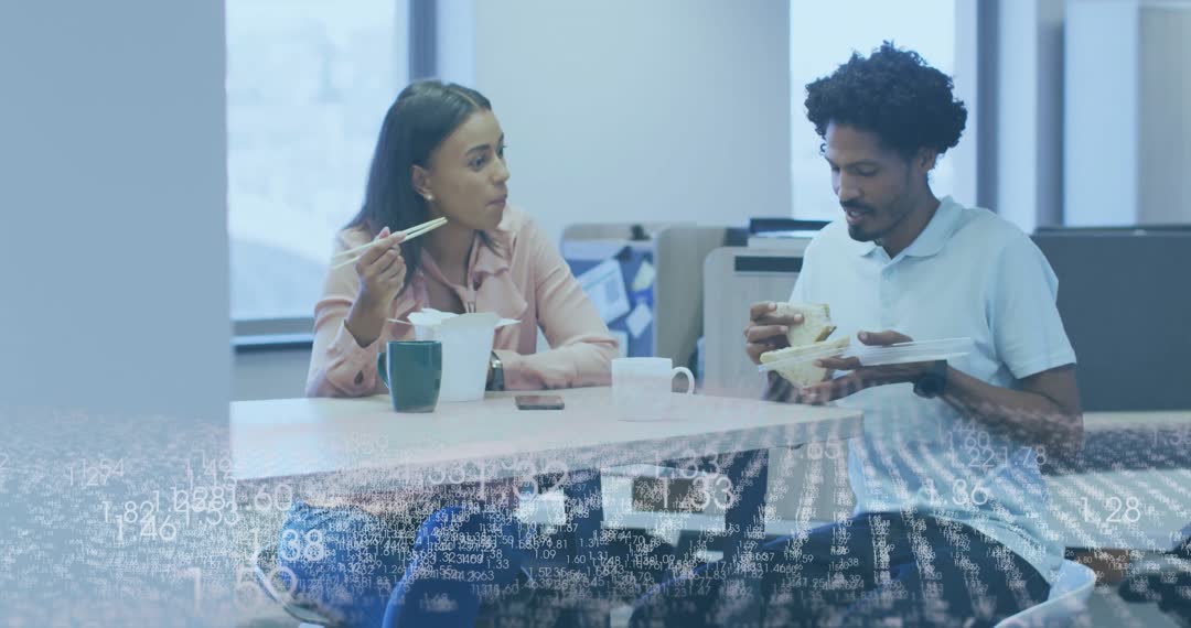- Colleagues Enjoying Lunch with Data Processing Overlay