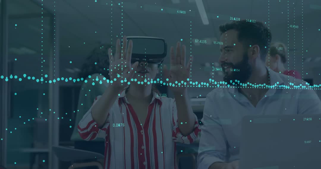 Two professionals are engaging with virtual reality technology to visualize and understand complex data in an office environment. Useful for projects depicting technological innovation, teamwork, and professional collaboration in a modern workplace setting.