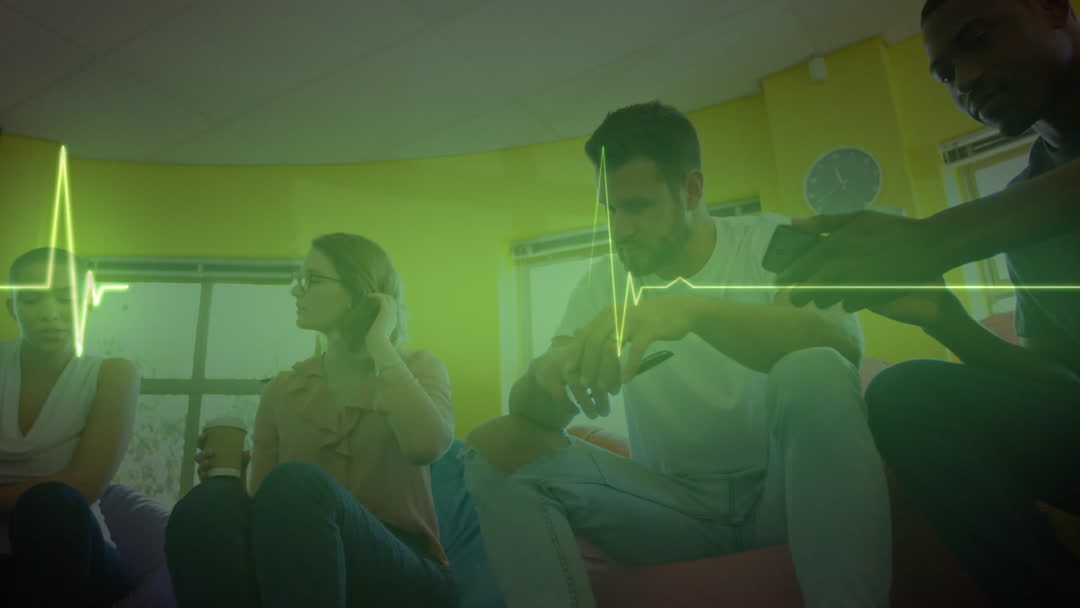 A group of diverse colleagues are seated in a modern office, engaging in discussion. The scene is creatively overlaid with a green heartbeat monitor wave, symbolizing the integration of health monitoring technology into business settings. This visually engaging and symbolic concept highlights innovation and professionalism. Useful for illustrating ideas about workplace wellness, business meeting contexts, health technology in corporate environments, and teamwork dynamics.
