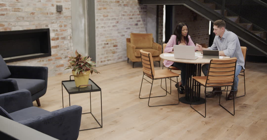 Two colleagues are seen at a wooden table in a contemporary office layout, discussing a project while viewing a laptop in front of them. The setting is equipped with comfortable seating and natural wooden floors, indicating a modern and collaborative workspace environment. This could be used for promotions related to diverse workplace collaboration, modern business strategies, and team meetings in a corporate setting.