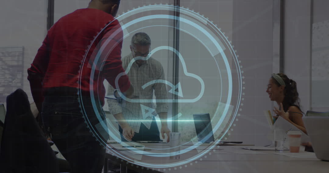 Depicts colleagues interacting in a conference room with an overlay of digital cloud and cyber security symbols, conveying information protection and data privacy ideas. Ideal for illustrating modern technology integration in business environments, suggesting themes of collaboration, innovation, security awareness, and cloud technology in corporate settings.