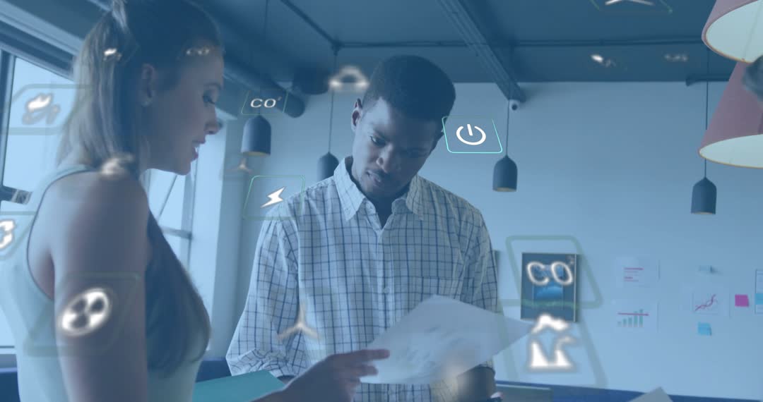 Scene captures two colleagues analyzing eco-friendly data demonstrated through augmented reality (AR) technology within a modern office. Ideal for emphasizing themes of teamwork, innovation, technological advancement, and environmental focus in a workplace. Suitable for illustrating concepts related to modern collaborative methods, sustainable practices in business, and cutting-edge technologies in educational or corporate materials.
