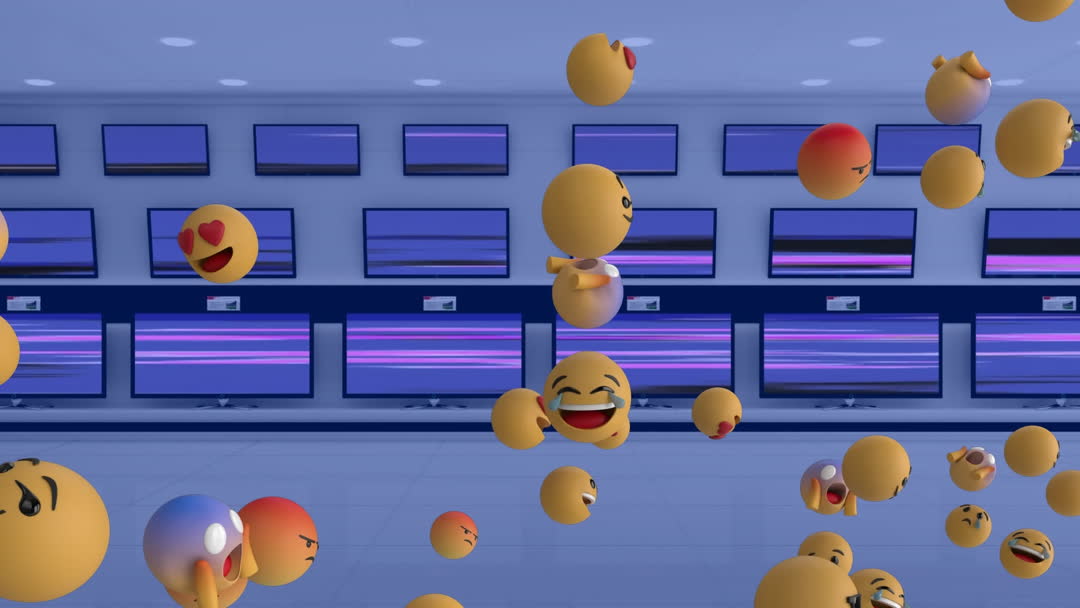 Brightly colored 3D emoji faces show various playful expressions, moving in a futuristic virtual space, surrounded by digital panels displaying vibrant hues. This lively scene is ideal for projects related to digital communication, social media marketing, technology, and creating an upbeat connection with digital audiences.