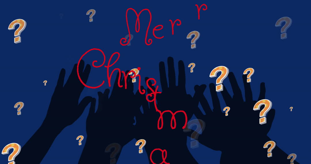 This digital art piece features an animated representation of 'Merry Christmas' with raised hands and scattered question marks on a festive, dark blue background. Ideal for use in digital holiday greeting cards, festive screen savers, or promotional materials for Christmas events, the video combines celebration with modernity, adding a unique touch to traditional holiday messaging.