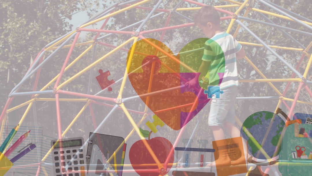 Image depicts vibrant animation celebrating Autism Awareness Month. In the background, a young Caucasian boy plays on playground equipment while a colorful heart and symbolic puzzle pieces represent autism. School-themed icons add educational elements. Perfect for use in awareness campaigns, educational settings, or articles highlighting inclusivity in children's activities.