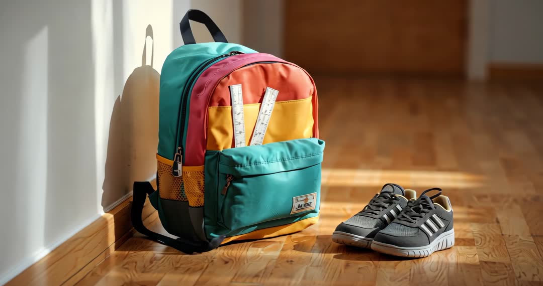 - Colorful Backpack and Sneakers on Boarding School Floor with Sunlit Atmosphere