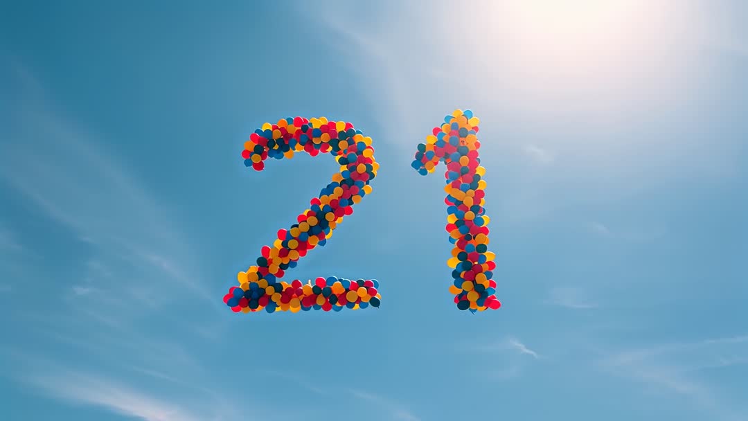 AI Generated Image. Showing colorful balloon clusters forming numeral 21, floating against bright blue sky with soft sun flare. Featuring vibrant red, yellow, and blue balloons creating bold festive silhouette while gentle breeze adds subtle movement. Presenting wide area of open sky for text, logo, or title overlays on right side. Ideal for birthday promotions, anniversary announcements, milestone campaigns, party invitations, event openers, social media reels, and celebratory ads. Working well as animated opener, looped background, or hero shot for web banners and livestream intros. Recommend applying slow motion, color boost, and lens flare accent to enhance joyful mood and visibility. Compatible with HD and web formats. AI-generated content tag included for licensing clarity.