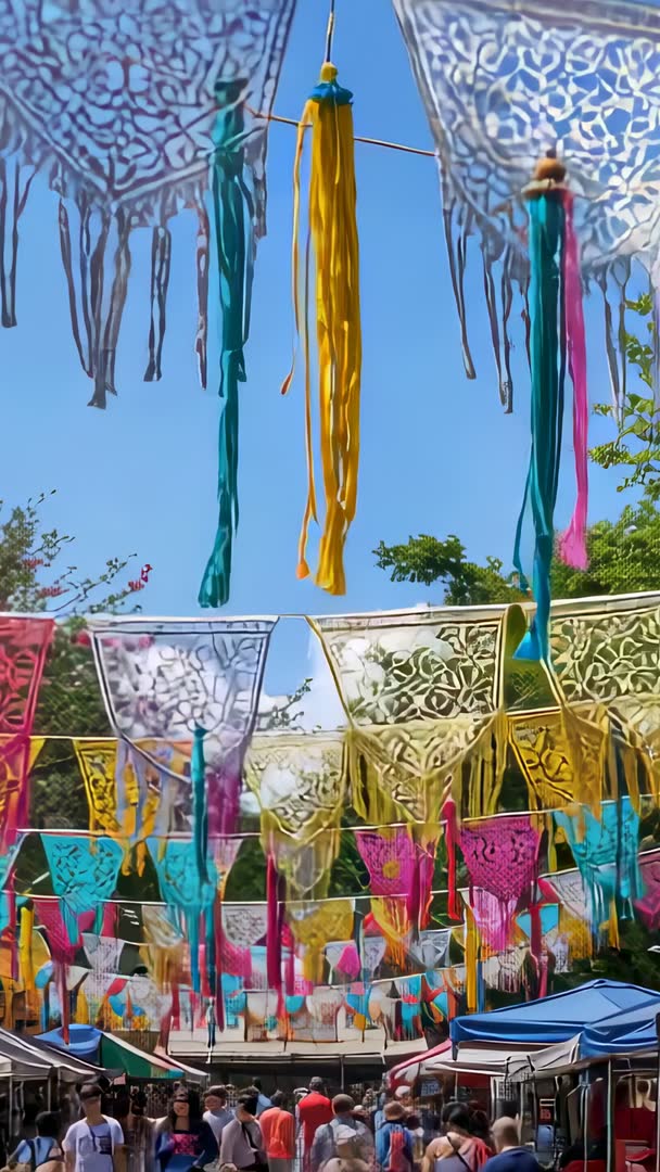 AI Generated Video. Showing colorful bunting, lace pennants, and long tassels swaying in breeze above busy outdoor market, camera rising to reveal rows of stalls, vendors, and moving crowd under bright blue sky. Vibrant color palette of yellow, teal, pink creating festival canopy and dynamic overhead movement, providing energetic, celebratory visual. Providing ideal footage for social media vertical reels, festival promotion videos, tourism promos, market or craft fair advertising, seasonal campaign content, and lifestyle montages. Suggesting slow motion to accentuate fabric movement, adding upbeat music and ambient crowd sound for immersive mood, applying warm color grade to enhance festive vibe, and placing logo or text overlay in lower frame where stalls and crowd provide stable background. Delivering versatile clip for brands, event organizers, municipalities, travel agencies, and content creators seeking cheerful summer visuals.