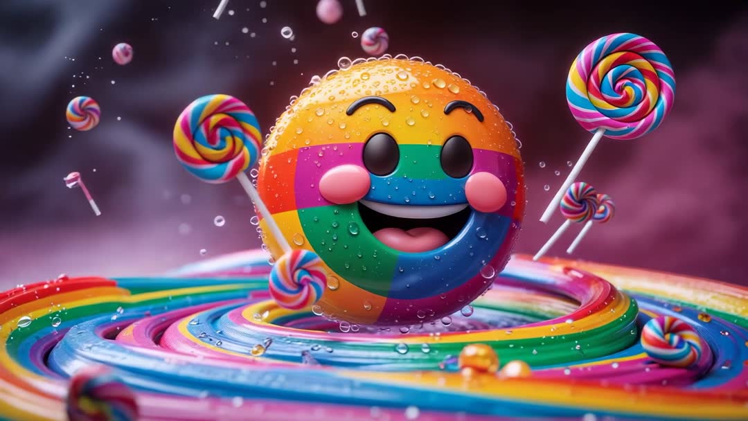 AI Generated Image. This vibrant fantasy scene depicts a rainbow-hued sphere with an animated smiling face, rotating amidst swirls of colorful liquid and surrounded by an array of multi-colored lollipops. The playful and whimsical design makes this video ideal for use in playful digital Content, animated videos, fantasy-themed projects, or as a backdrop for creative children's materials.