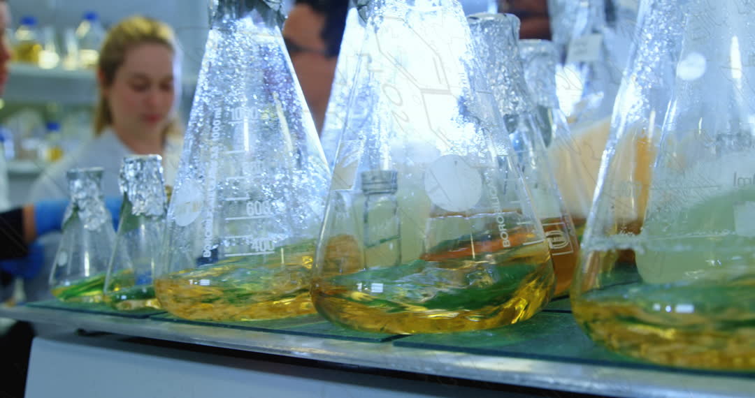 Laboratory scene featuring amber chemical solutions and animated formulas in the foreground. Used for illustrating concepts in chemistry, scientific research and education.