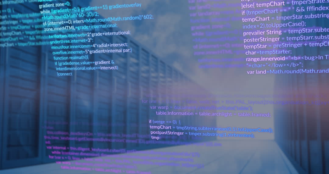 The video shows a dynamic overlay of colorful coding scripts against a blurred background of a server room aisle. This concept represents the high-speed data processing and complex networking operations within modern IT infrastructures. Ideal for representing themes like cybersecurity, advanced computing, tech development, and modern data management solutions in presentations, websites, and marketing materials for tech companies.