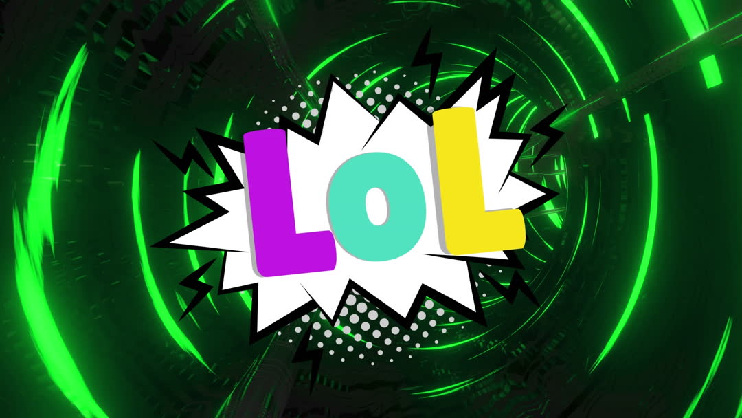 This vibrant animation features a comic-style 'LOL' text in bright colors over a green neon tunnel backdrop. Ideal for use in comedy-related content, digital media projects, or as a dynamic visual element in social media posts. The playful design can accentuate humor in online content or digital advertisements.