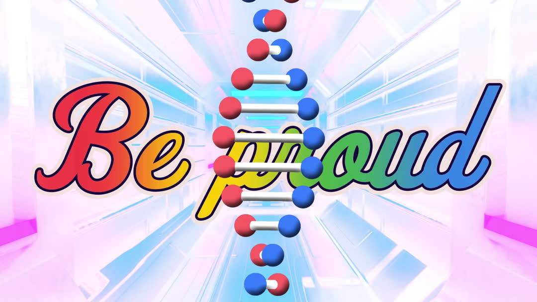 Vibrant and engaging artwork featuring a DNA helix intersecting the words 'Be proud' showcases a dynamic blend of genetics and positive affirmation. Ideal for educational materials, scientific presentations, or awareness campaigns.