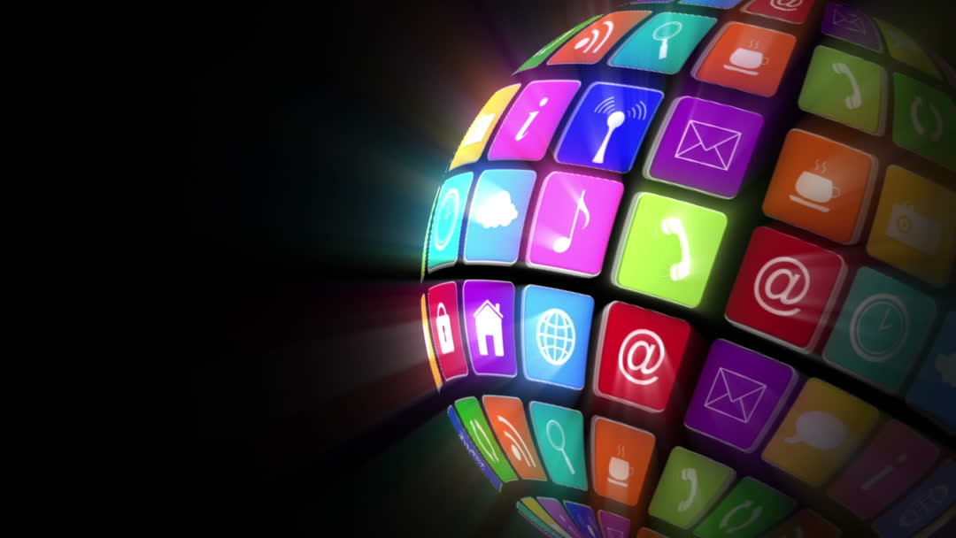 Image shows a vibrant globe consisting of various digital icons representing app functionalities. Ideal for illustrating global connectivity, technology ecosystems, or internet communications. Useful for tech-themed publications, digital marketing campaigns, and modern web designs.