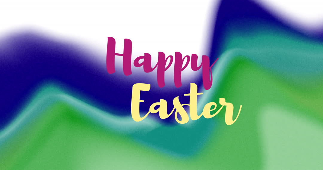 Colorful Easter greeting with 'Happy Easter' in vibrant colors over a blurred abstract background featuring blue, green, and white shades. Perfect for holiday cards, social media posts, and festive spring season promotion materials.