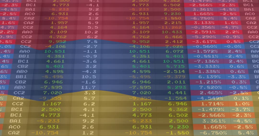 This video shows a vivid, multilayered depiction of financial data with rows and columns. Numbers, depicted in various vibrant colors, likely represent changes in stock market data or business analytics. Ideal for presentations or articles about finance, investment, data analysis, or economic trends. Useful in conveying modernity and complexity of financial analytics in professional tools or marketing materials.