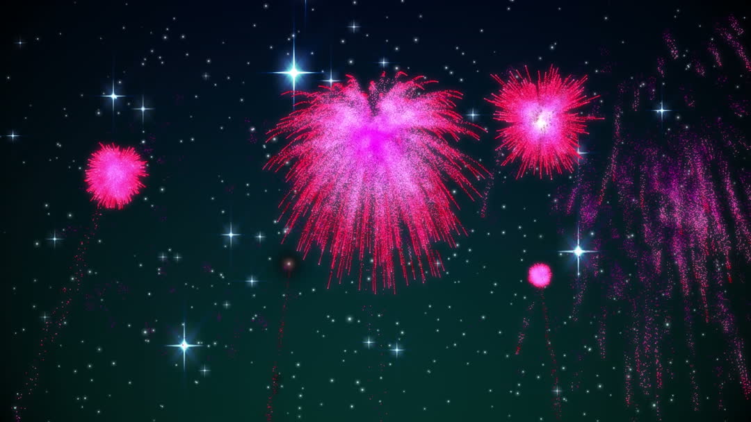 Vibrant digital depiction of fireworks bursting across a starry night sky. Perfect usage could be for New Year celebrations, festive greeting cards, party invitations, or digital backgrounds. Emphasizes joy and excitement with bright visuals.