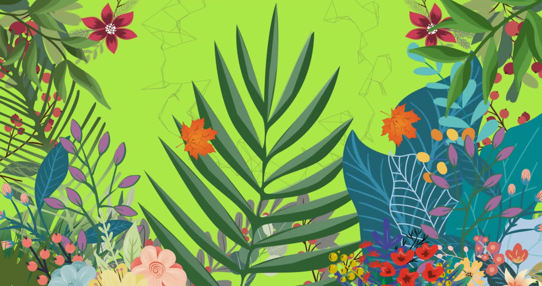 Vibrant animation features a mix of colorful flowers and lush foliage against a bright green background, perfect for projects highlighting digital art, nature themes, or celebratory designs. Ideal for use in digital marketing, graphic design, or as a lively background for creative media content.