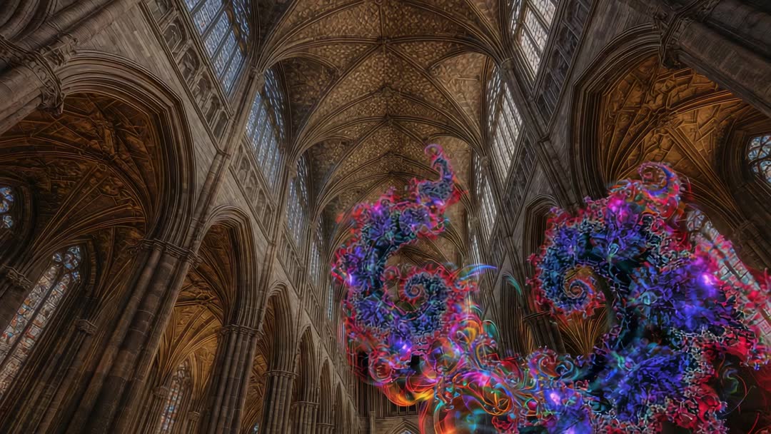 - Colorful Fractal Nebula Rising Through Gothic Cathedral Nave Featuring Animated Spiral Motion