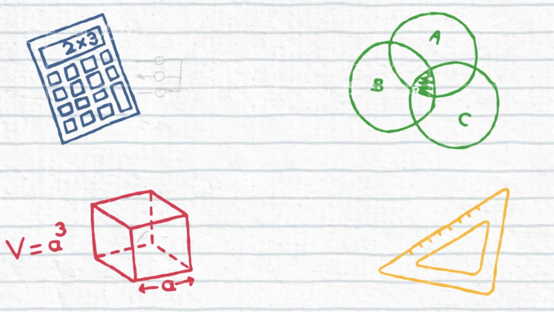 Vivid drawings of mathematical concepts including a calculator, Venn diagram, cube, and ruler are arranged on a white notebook background. This artistic representation highlights core mathematics and geometry fundamentals. Suitable for educational materials, school-themed designs, or digital interfaces focused on learning and academic pursuits.