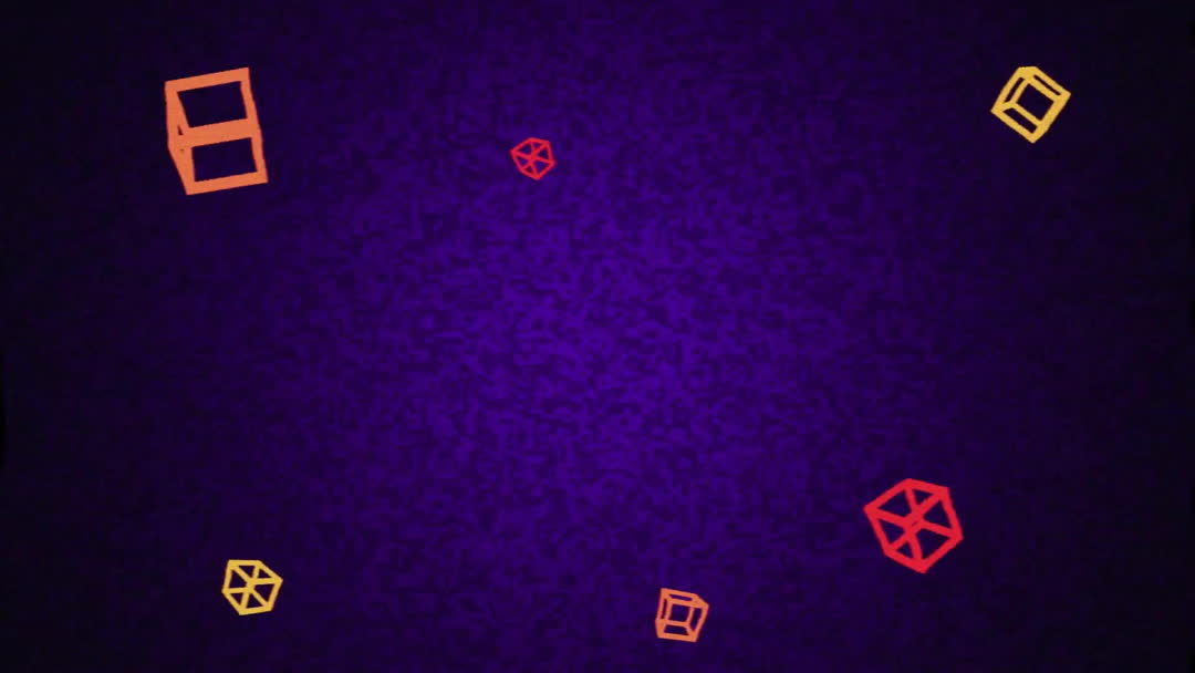 Abstract geometric shapes in varying hues of red and orange float on a deep blue background. The animation evokes a retro, tech-inspired aesthetic. Perfect for backgrounds, digital art projects, and media seeking a blend of color and movement.