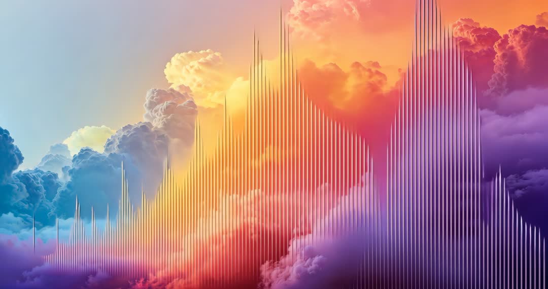 AI Generated Video. Dynamic clouds blend into a spectrum of colors as musical waveform bars emerge within the serene skyscape. Perfect for illustrating audio mechanics in vibrant, abstract-themed projects involving sound engineering, music technology, or creative digital art showcases.