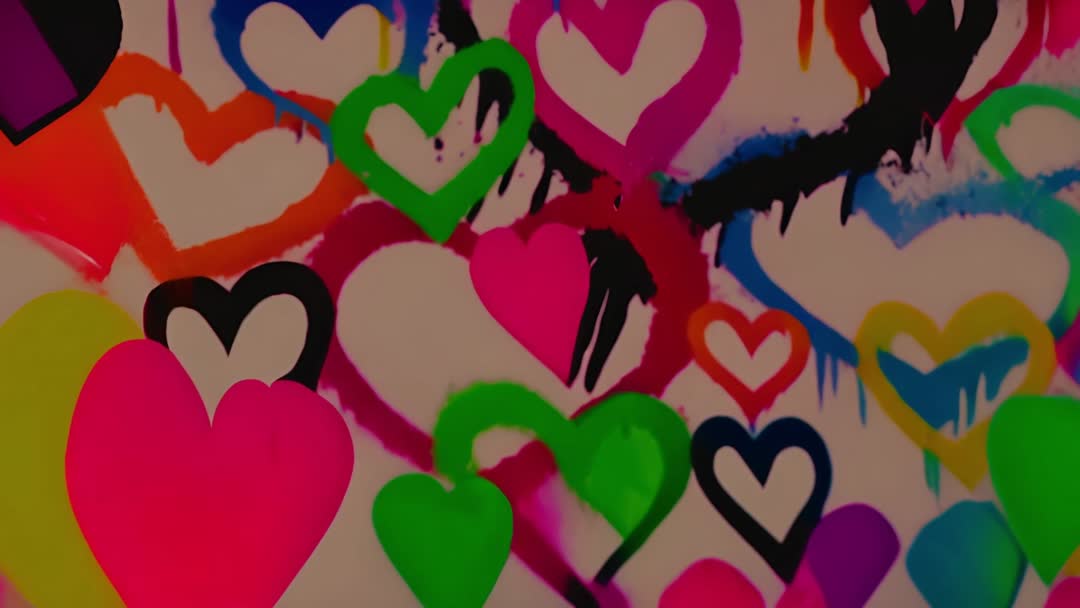 AI Generated Video. Bright and lively design featuring an array of overlapping hearts painted in neon colors. This creative expression with dripping effects captures the spirit of love and can add a playful, lively touch to art projects, young adult merchandise, or digital backgrounds.