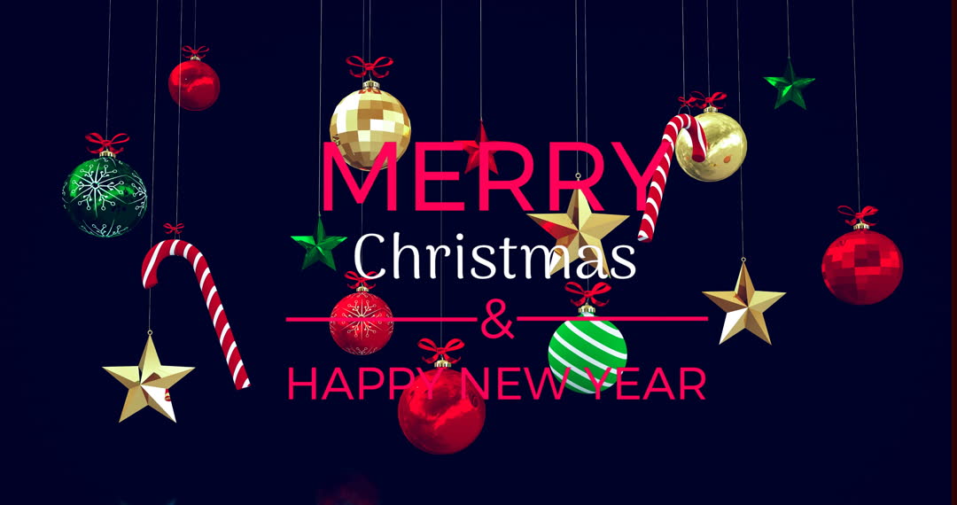 Colorful and festive Christmas and New Year greetings with hanging ornaments, including candy canes, stars, and baubles, set against a vibrant background. Ideal for social media posts, holiday greeting cards, and festive invitations, bringing cheer and excitement to any holiday-related design.