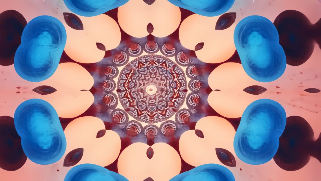 AI Generated Image. This video showcases a vibrant, kaleidoscopic mandala featuring symmetrical patterns with colorful geometric shapes. Capturing intricate forms and a mix of blue, peach, and dark red shades, it offers a mesmerizing visual experience. Useful for adding a creative touch to presentations, enhancing digital art projects, or serving as an aesthetic background for a meditation or relaxation setting.