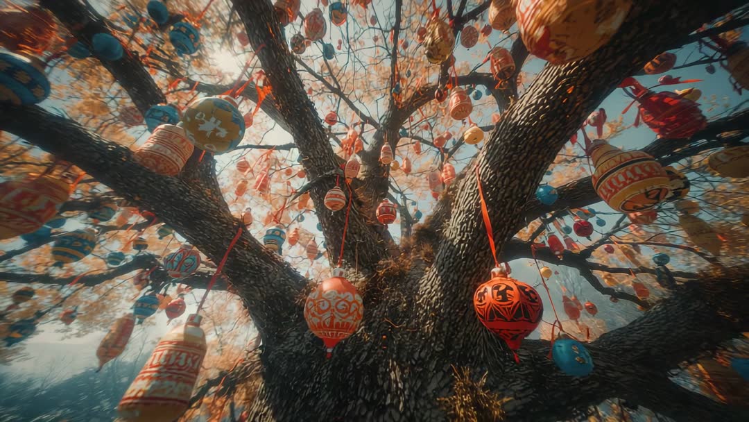 AI Generated Image. Objects sway gently on red ribbons, attached to a tree with an assortment of colors and patterns. Atmosphere is calm and serene, with a touch of artistry and festivity. Ideal for use in projects related to holiday celebration, outdoor festivals, cultural events promotion, decorative arts or nature-themed branding. Provides an imaginative blend of natural beauty with human creativity.