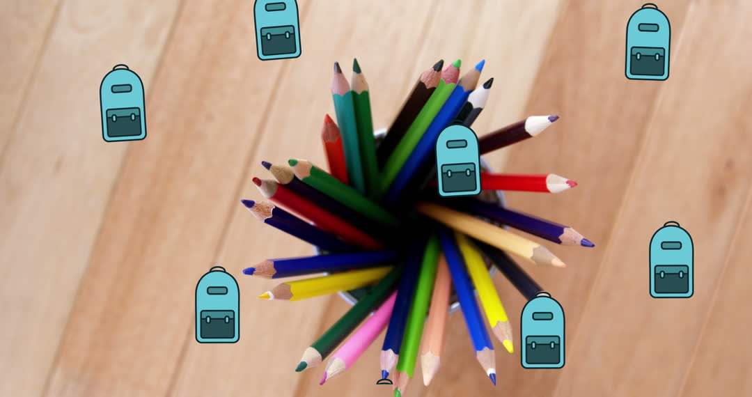 - Colorful Pencils in Container with Backpack Icons Overlay