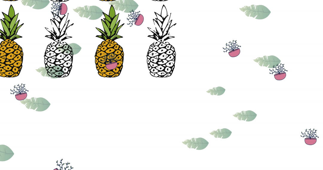 Design features vibrant pineapples and leaves scattered playfully on white background, evoking lively and fun theme suitable for celebration and holiday contexts. Ideal for use in festive digital greetings, creative projects, or playful digital marketing campaigns adding whimsical and quirky touch.