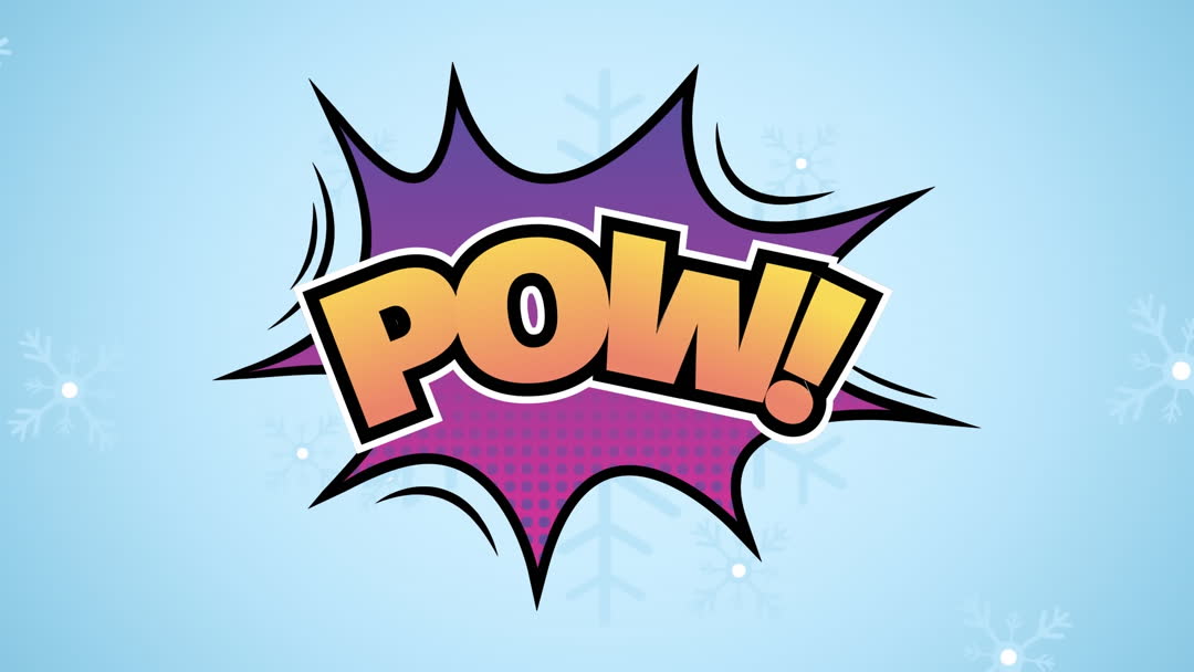 Graphic featuring a vibrant 'POW!' text encapsulated in a purple speech bubble against a light blue background with snowflake details, evoking a classic comic book aesthetic. Ideal for creative designs, announcements, retro-themed communication materials, or whimsical backdrops. Great for projects seeking eye-catching, dynamic visuals or playful graphic overlays.